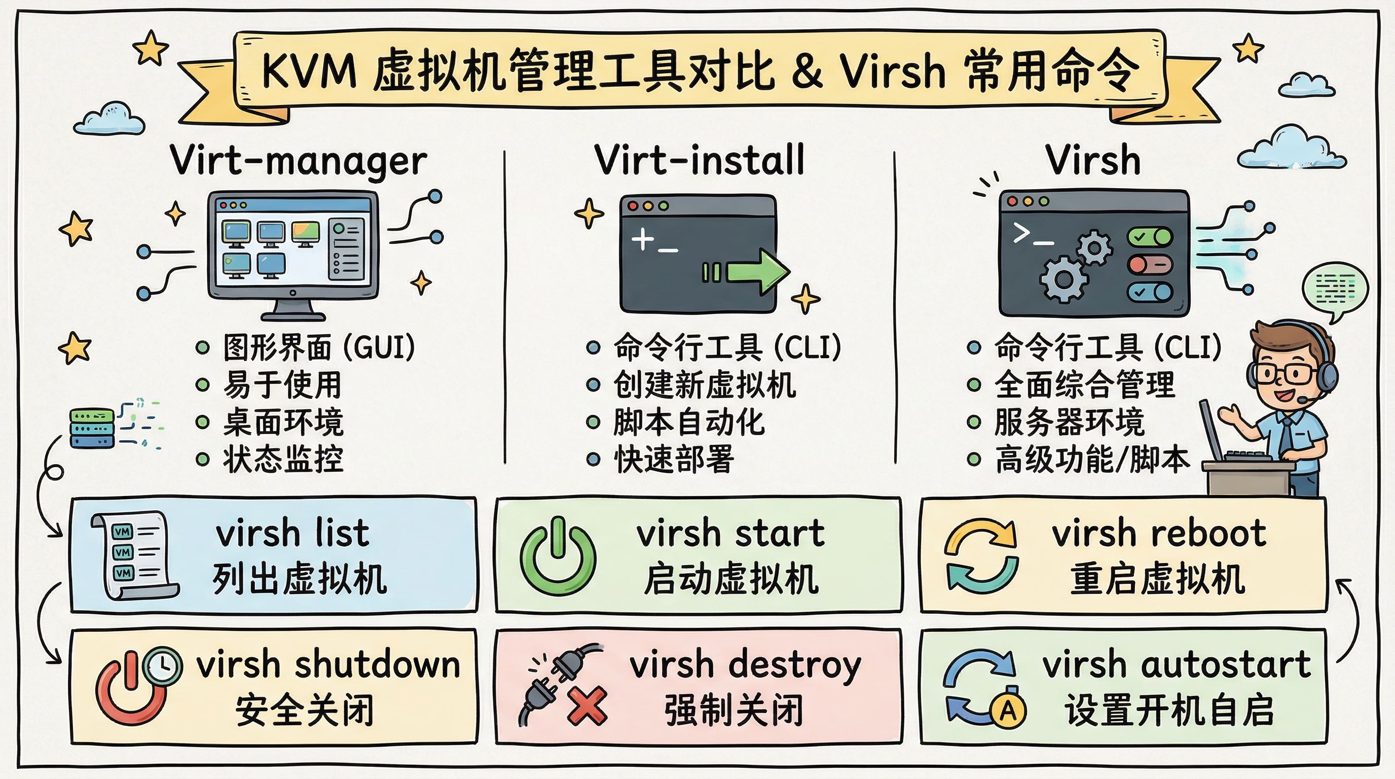 - virt-manager:KVM 的图形化管理工具(如果没有图形界面可不装)。