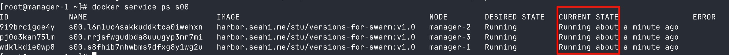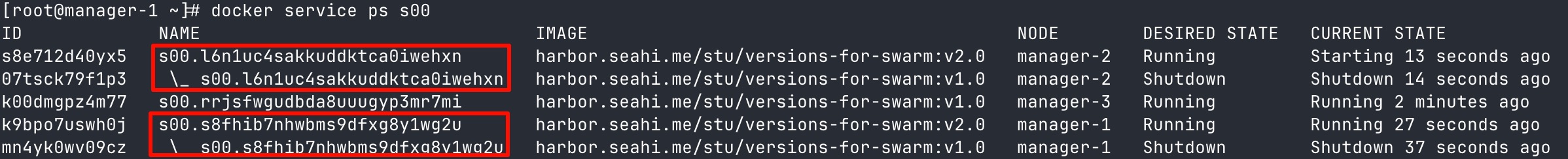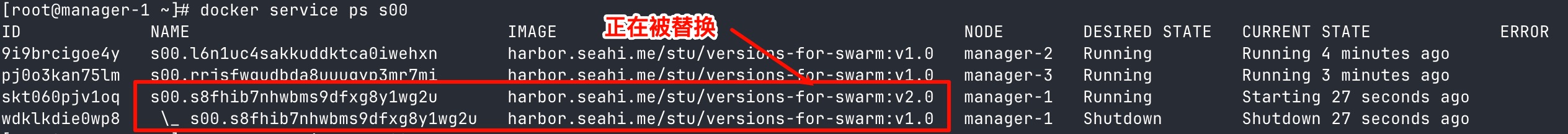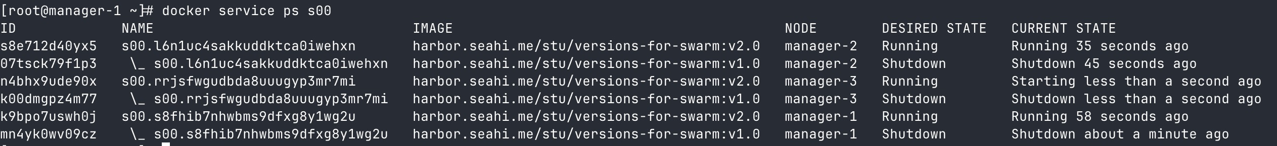 docker service update s[学号后两位] --image harbor.seahi.me/stu/versions-for-swarm:v2.1
