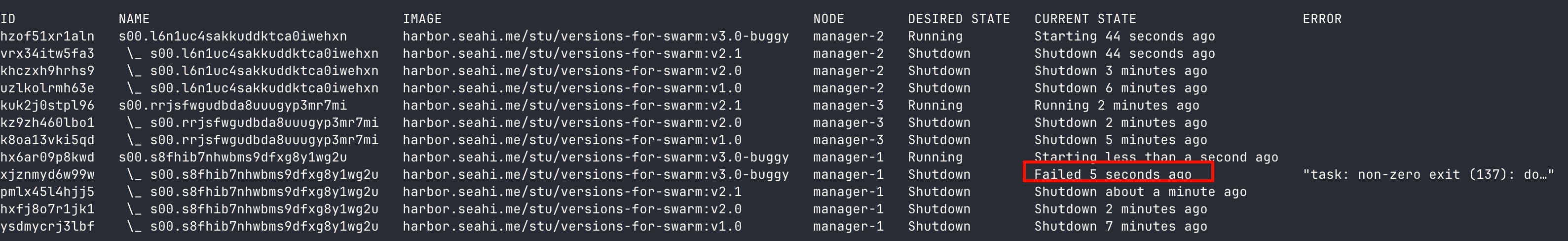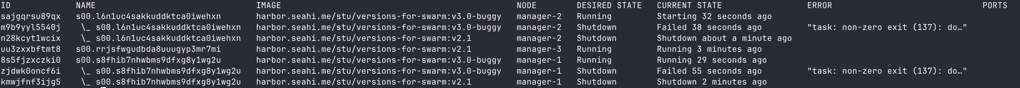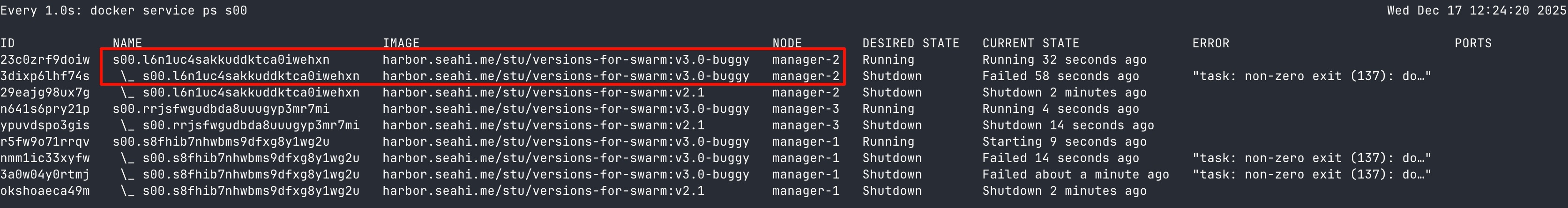docker service update s[学号后两位] --image harbor.seahi.me/stu/versions-for-swarm:v3.0-buggy
